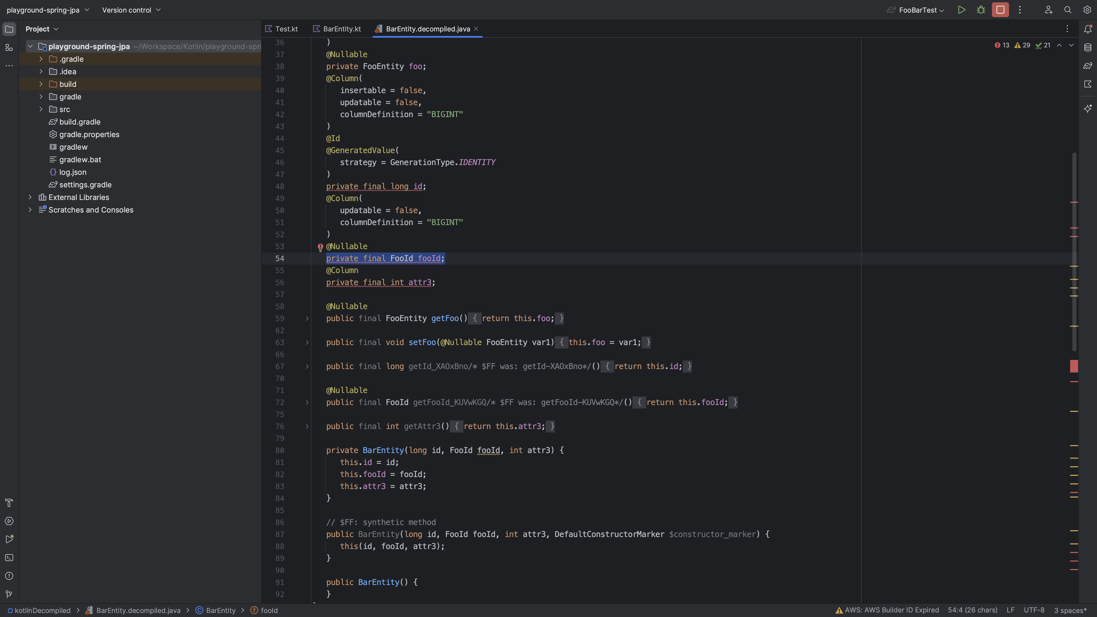 fooId를 FooId로 가지고 있다. 이 때문에 JPA는 FooId라는 클래스로 인식하고 객체를 통째로 넣는 시도를 하는 것이다. value class는 분명 unwrap되어야 할텐데 Java primitive type에는 null을 사용할 수 없다는 문제에서 기인하다.
