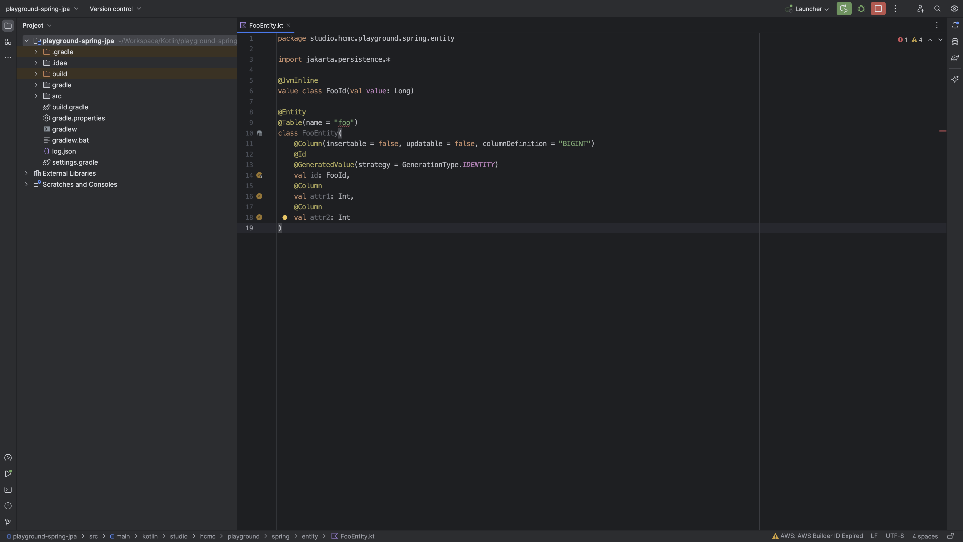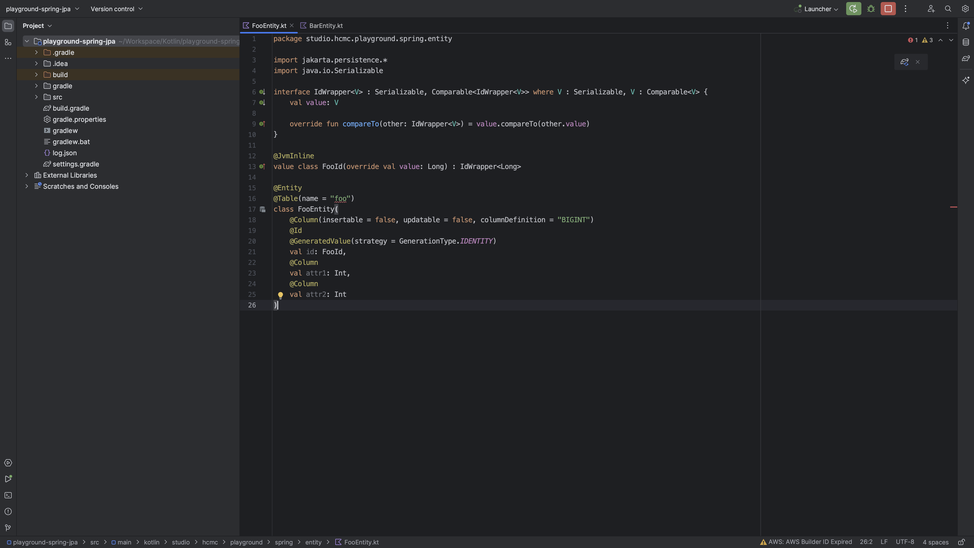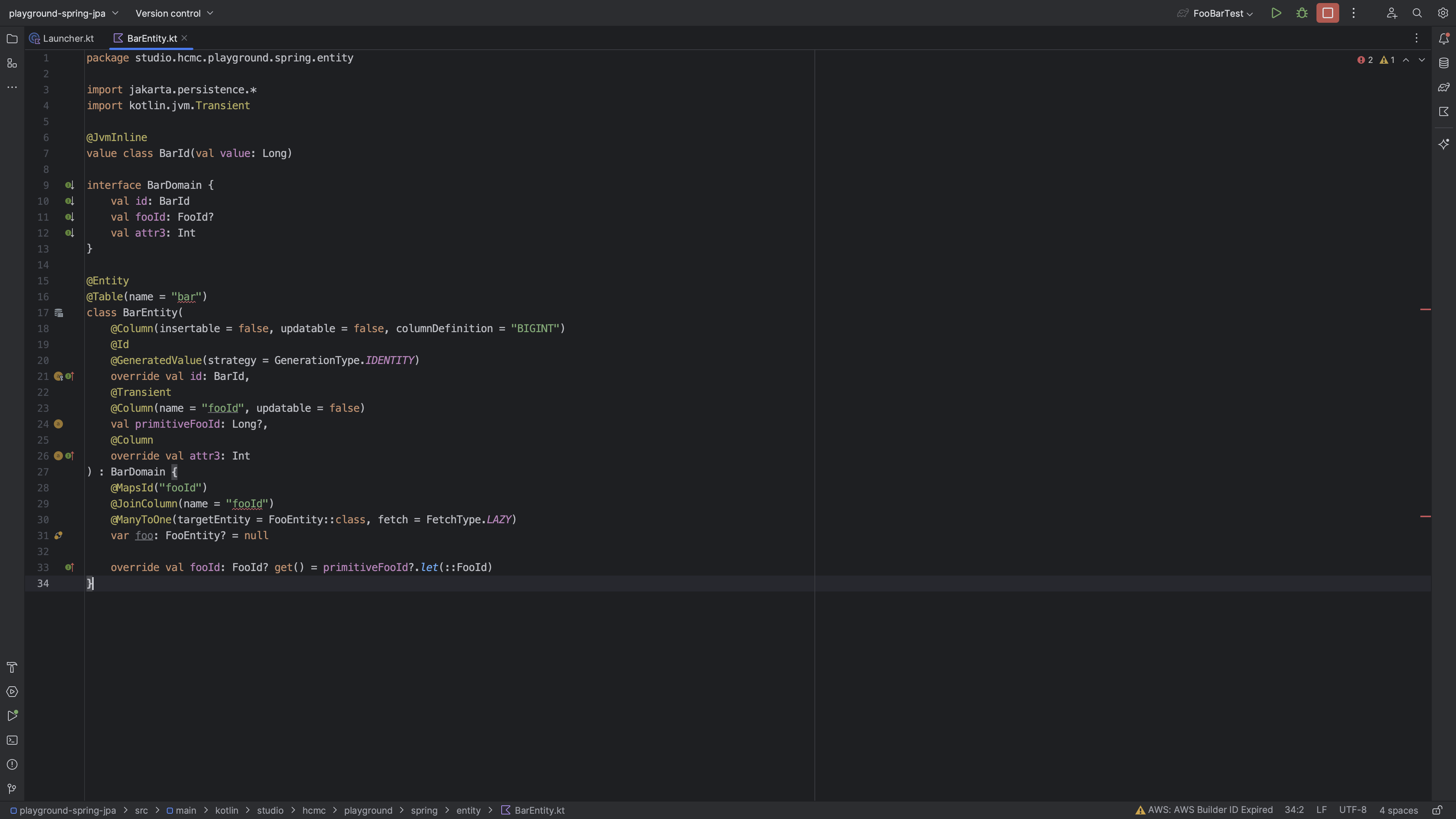 코드에서 표시하듯 FooId가 nullable일 때 Basic 타입 추론을 실패하여 오류로 취급한다. Inspection 수준에서 처리할 수 있도록 해주는 것이다. 여기까지만 보면 적당히 Entity에서는 primitive type으로 사용하면 될 것 같아보인다. 하지만 FooId가 IdWrapper를 상속받는 클래스였다면 어떻게 될까?