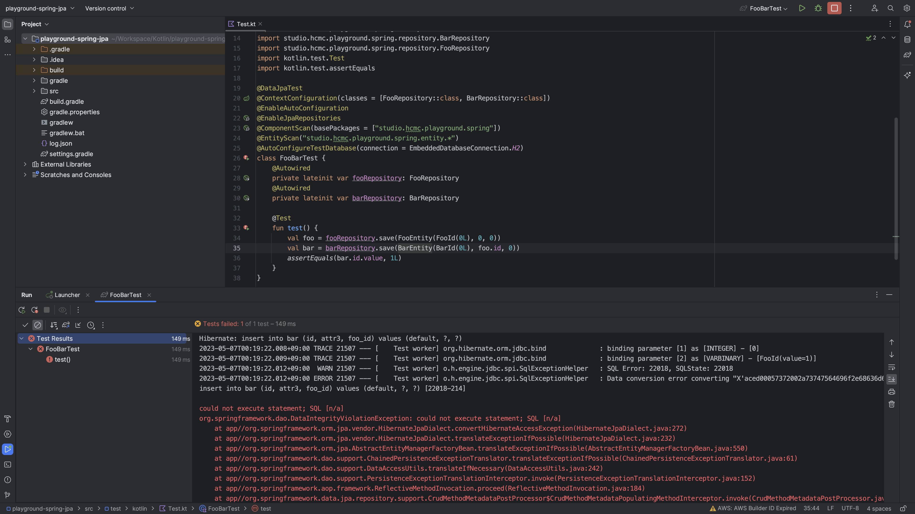 Table `bar`의 insert SQL 2번 parameter가 FooId로 전달된다. 따라서 hibernate가 VARBINARY로 인식하고 적어도 BIGINT는 아닐 것 같은 값을 삽입하려고 시도한다. 왜 이런 오류가 발생할까? 예상할 수 있듯 FooId가 unwrap되지 않은 것이다.