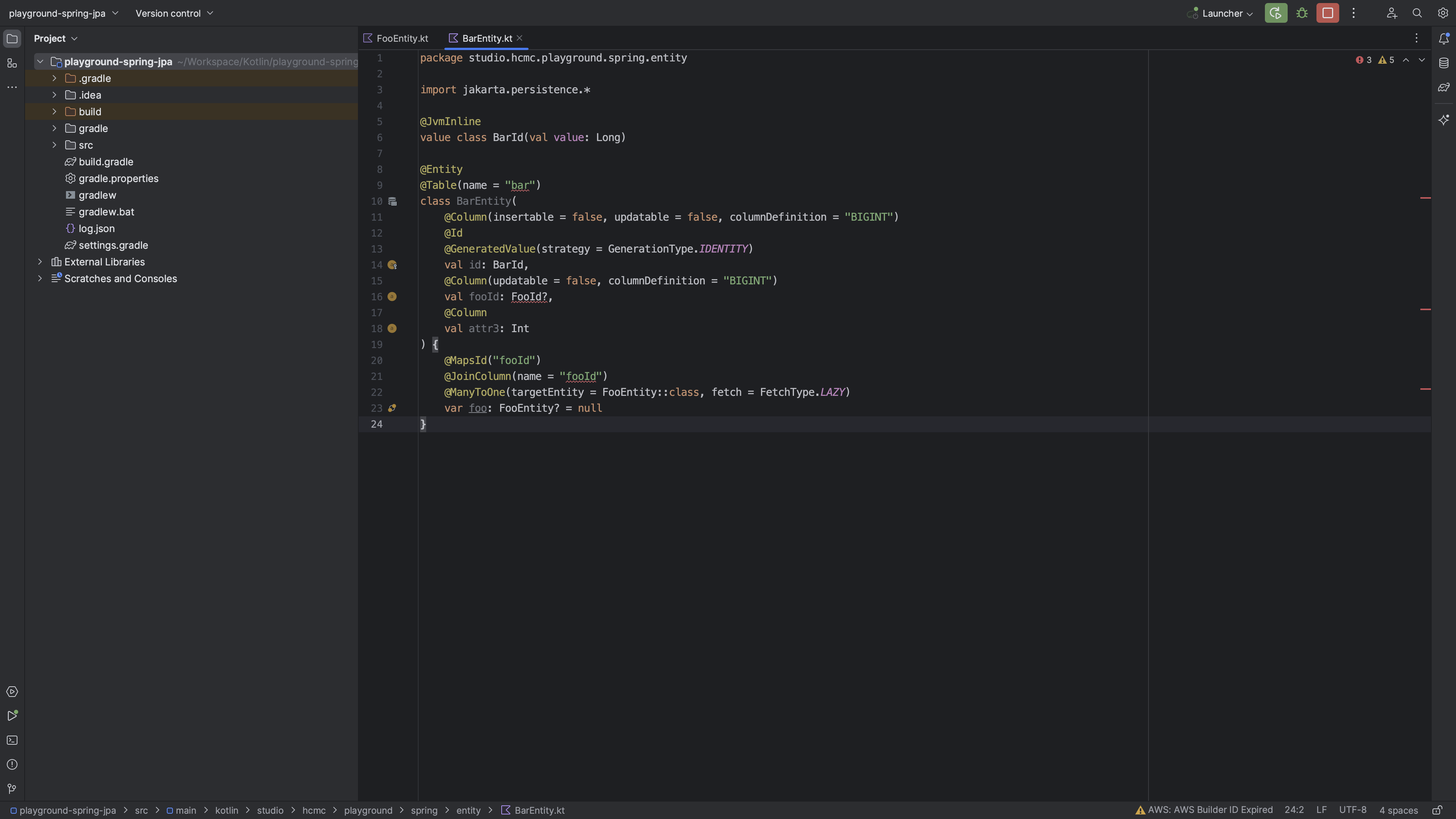 여기까진 아무런 문제가 없다. JpaRepository를 사용하더라도 ID에 unwrap된 type을 넣어준다면 findById까지 완벽히 작동한다. 이때, table `foo`를 참조하는 table `bar`가 있고 이게 optional할 때를 가정하고 BarEntity를 작성해보자.