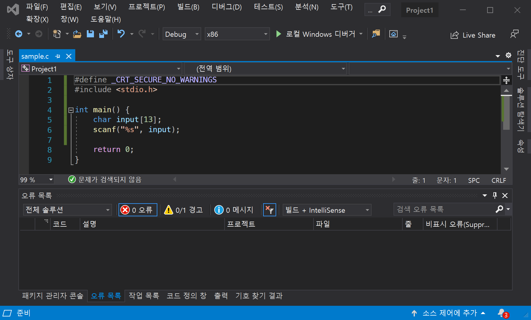 너무나 간단하게 소스 코드 어딘가, scanf가 나오기 전에 '_CRT_SECURE_NO_WARNING'을 define한다.