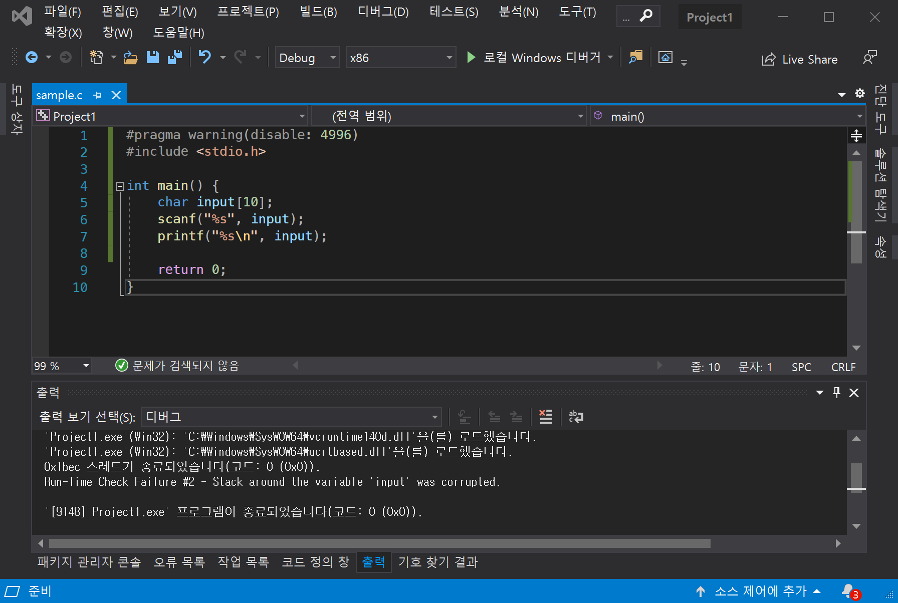 'Run-Time Check Failure #2 - Stack around the variable '변수명' was corrupted'란다. 대충 발생하는 원인은 크기에 맞지 않은 데이터가 들어갔을 때 발생한다. input이란 배열이 저장된 메모리 구조를 떠올려보자.